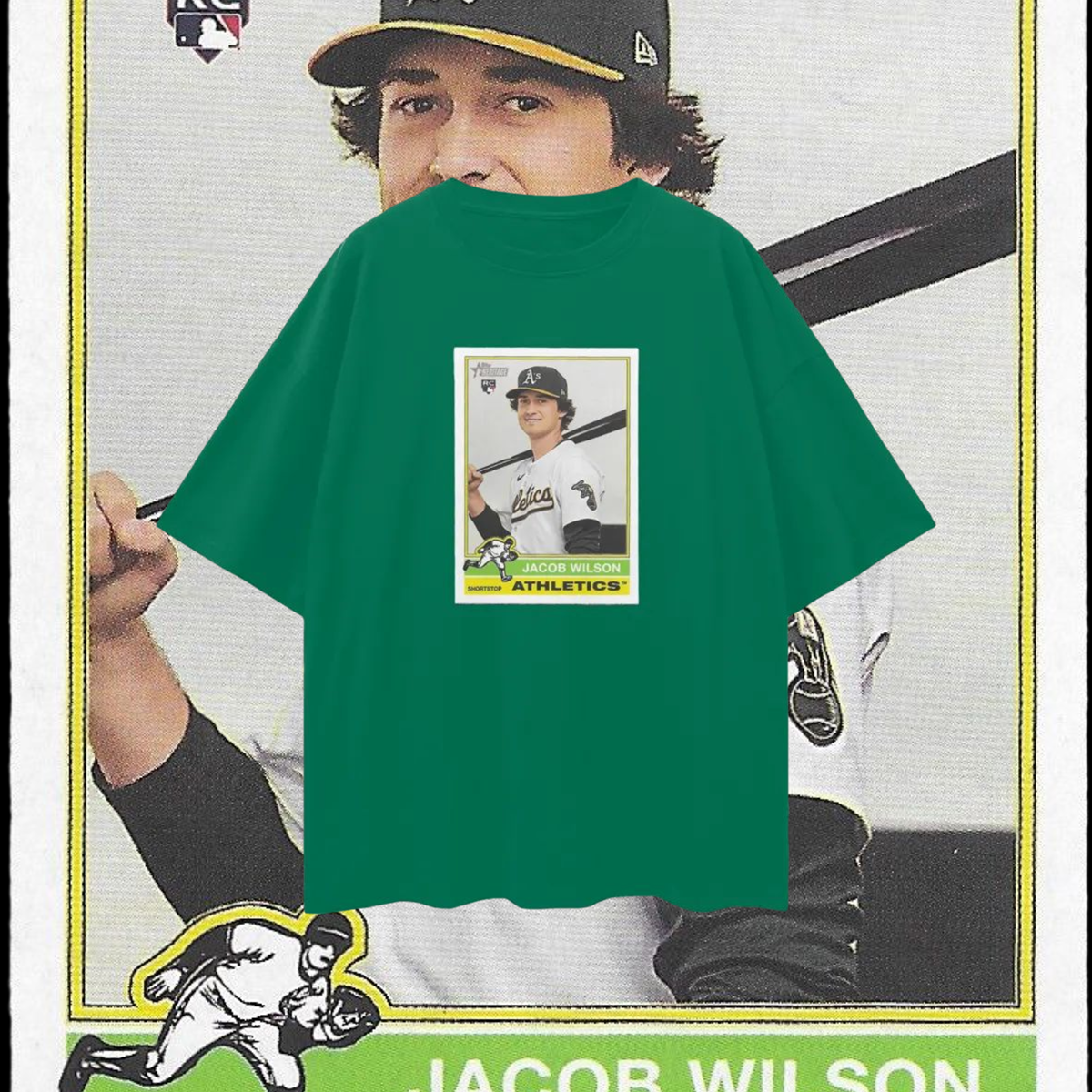 The Jacob Wilson Athletics Rookie Card T-Shirt is a vintage-style, oversized graphic tee that celebrates the athlete's rookie card, making it a stylish and nostalgic piece for sports fans. Its retro design and bold graphics evoke a classic feel, perfect for casual wear or supporting Jacob Wilson's athletic journey.