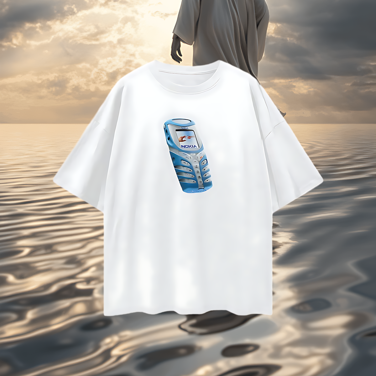 A retro-inspired graphic oversized T-shirt featuring a vintage Nokia Y2K phone design. The graphic showcases a nostalgic, 2000s-era aesthetic with bold, vibrant colors, pixelated details, and a slightly distressed look to evoke the early 2000s vibe. Perfect for streetwear and vintage fashion lovers, this tee combines nostalgia with modern oversized style for a bold, trendy statement.