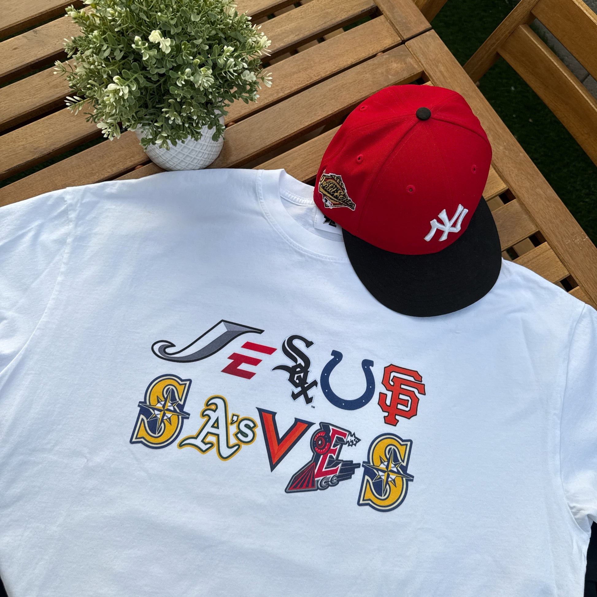 Make a bold faith-filled statement with this oversized “Jesus Saves” graphic tee, creatively designed using iconic sports team logos to spell out the powerful message. Perfect for believers who love both Jesus and sports, this shirt combines streetwear edge with spiritual truth. Featuring vibrant, high-quality graphics on a comfy, relaxed fit tee—this piece is a must-have for daily wear, church events, or just repping your faith in style.