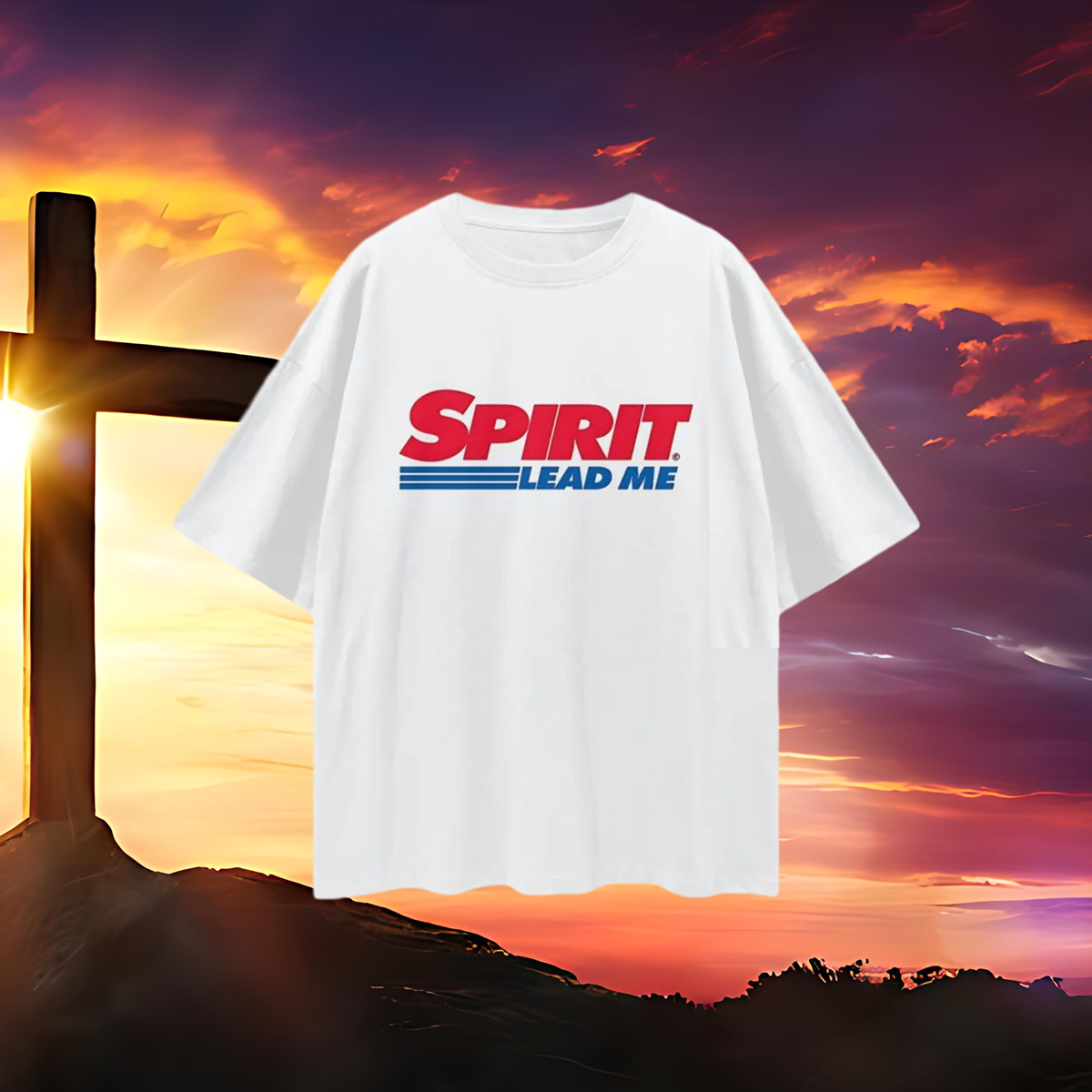 Create a vintage-inspired oversized T-shirt design featuring a 'Religious Spirit Lead Me' slogan, styled with bold, colorful graphics reminiscent of 90s and Y2K aesthetics. Incorporate retro fonts, vibrant hues, and nostalgic elements to evoke the era’s unique graphic style, making it eye-catching and reminiscent of classic vintage tees.