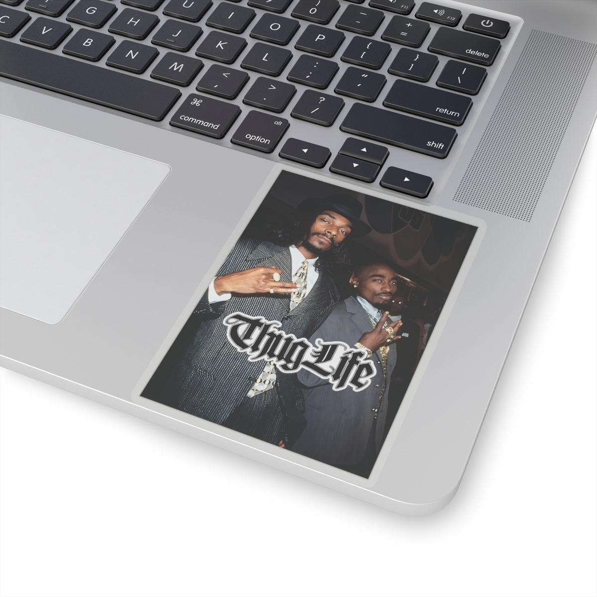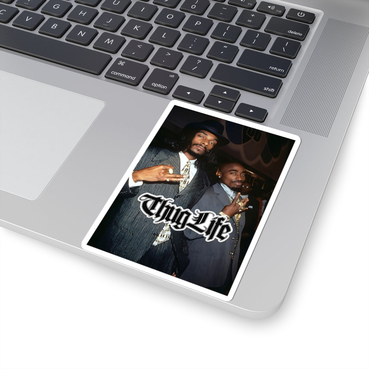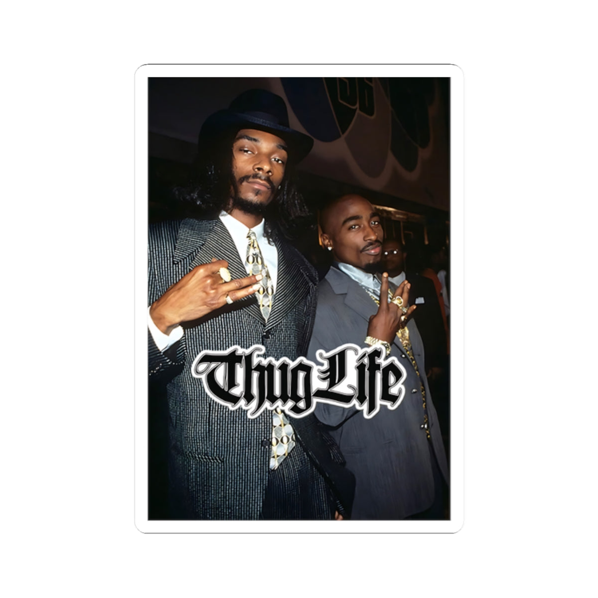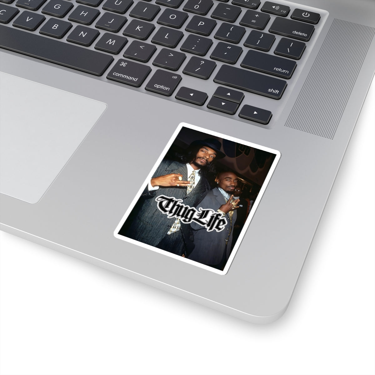 A cartoon-style sticker featuring Snoop Dogg with a relaxed and confident pose, wearing sunglasses and a bandana, with a gold chain around his neck. The background includes graffiti elements and bold, vibrant colors. Incorporate the iconic 'Thug Life' text in graffiti font, with a cool and edgy rap vibe. The overall style is playful yet street-wise, perfect for a rap-themed sticker