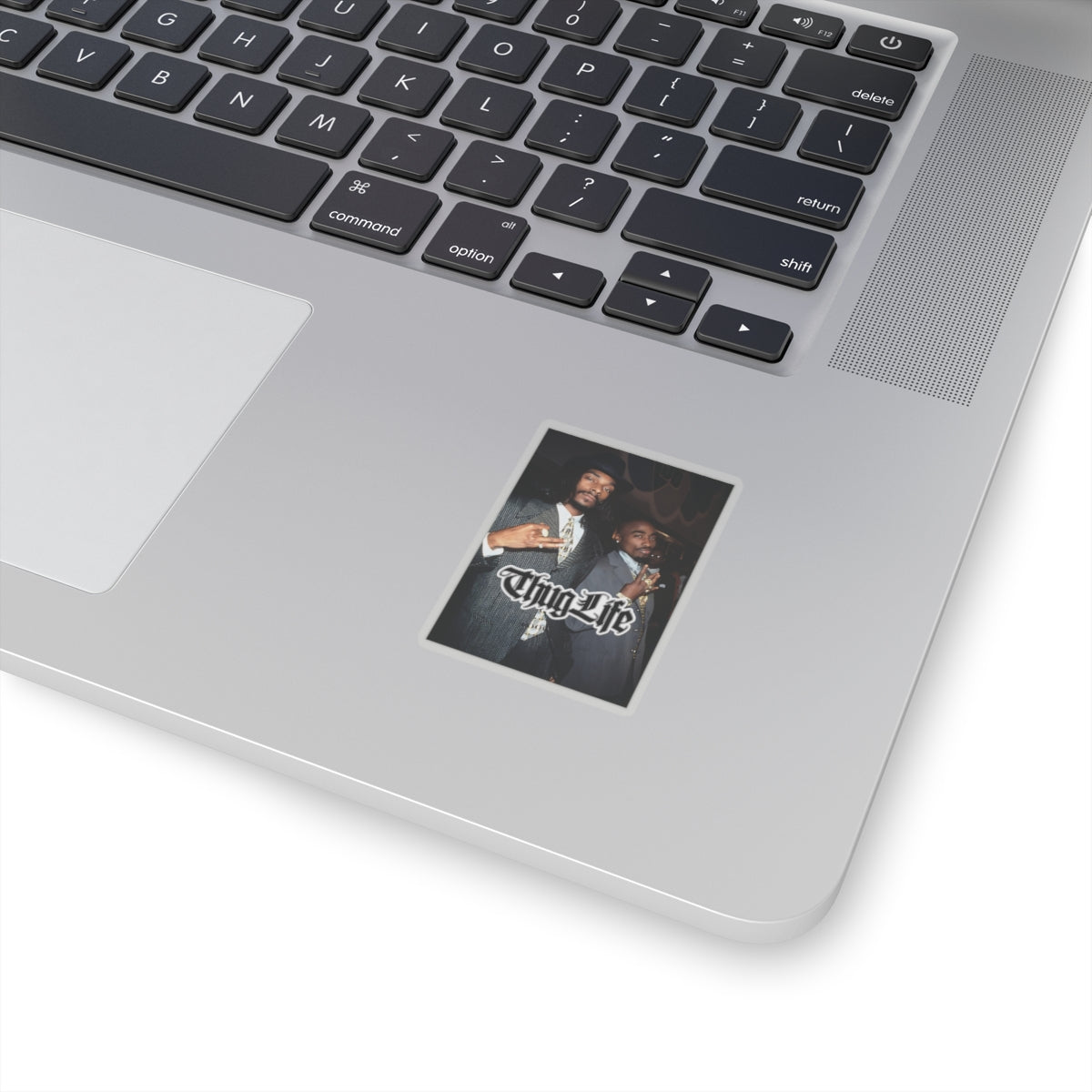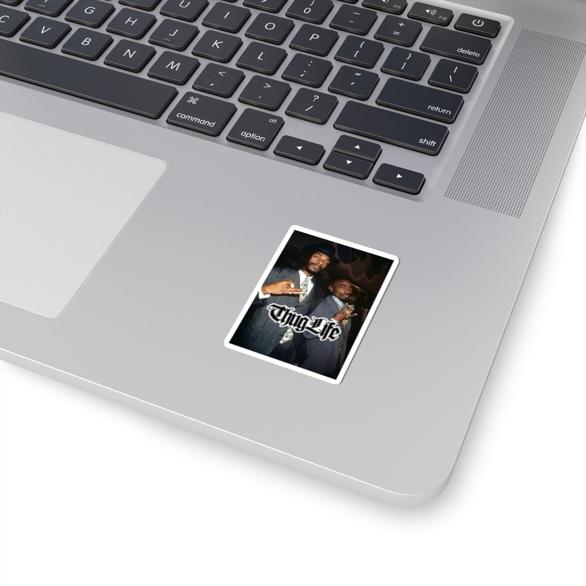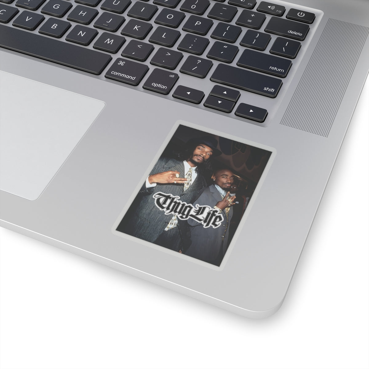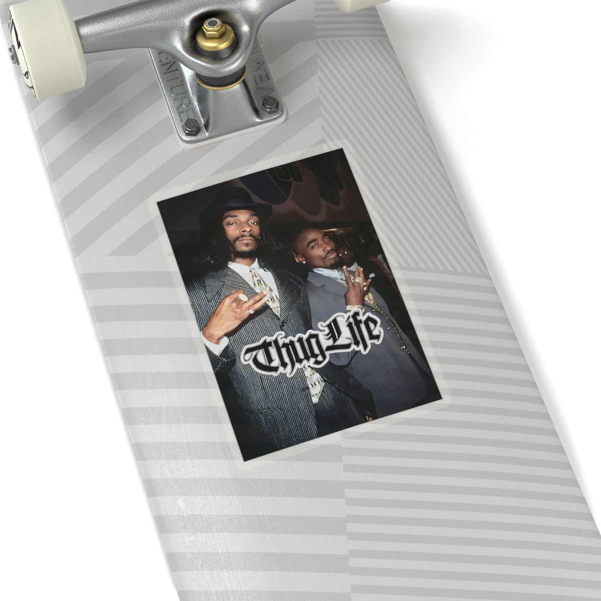 A cartoon-style sticker featuring Snoop Dogg with a relaxed and confident pose, wearing sunglasses and a bandana, with a gold chain around his neck. The background includes graffiti elements and bold, vibrant colors. Incorporate the iconic 'Thug Life' text in graffiti font, with a cool and edgy rap vibe. The overall style is playful yet street-wise, perfect for a rap-themed sticker