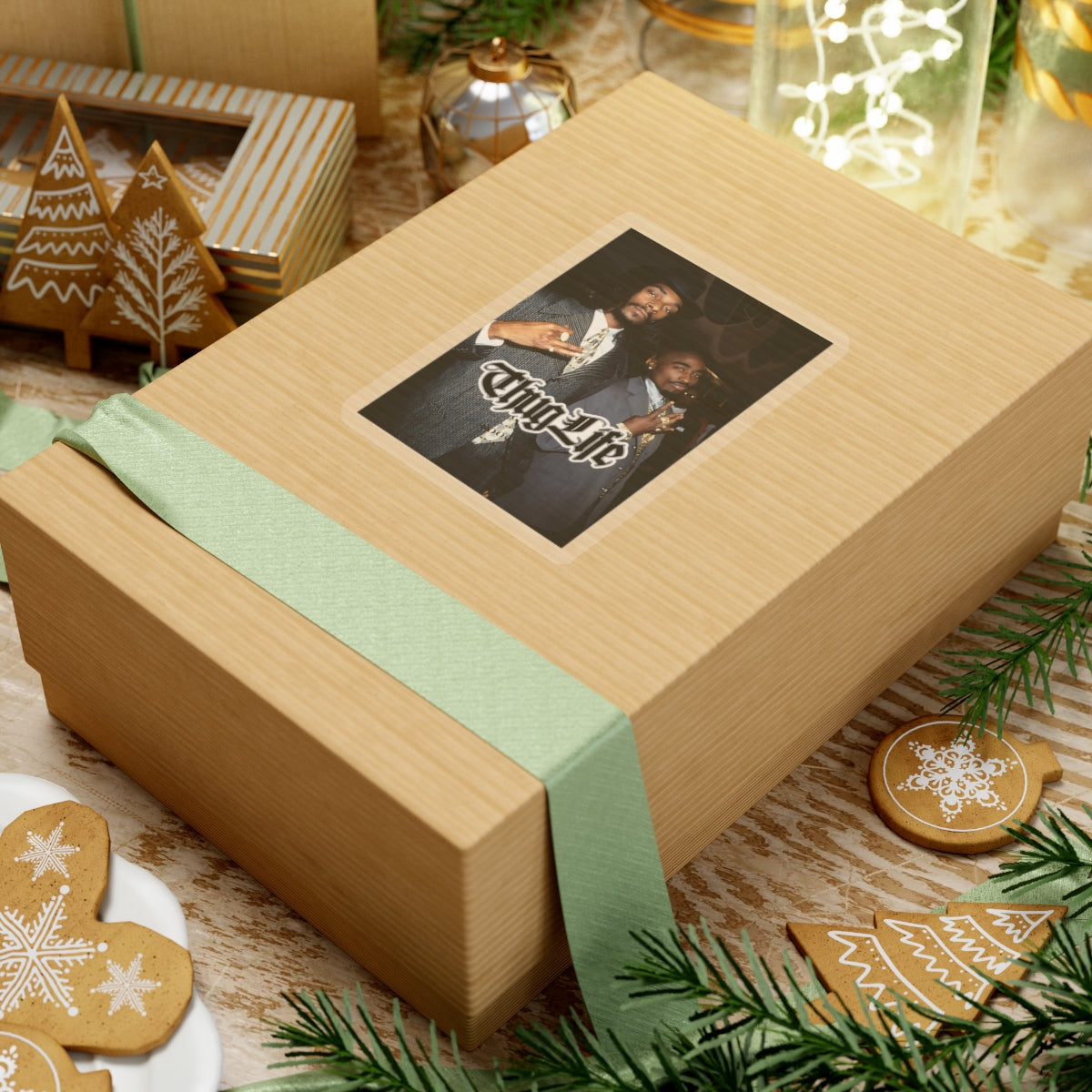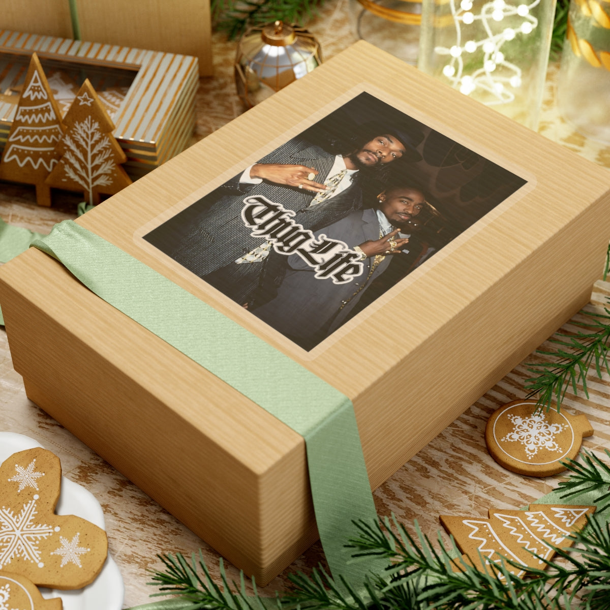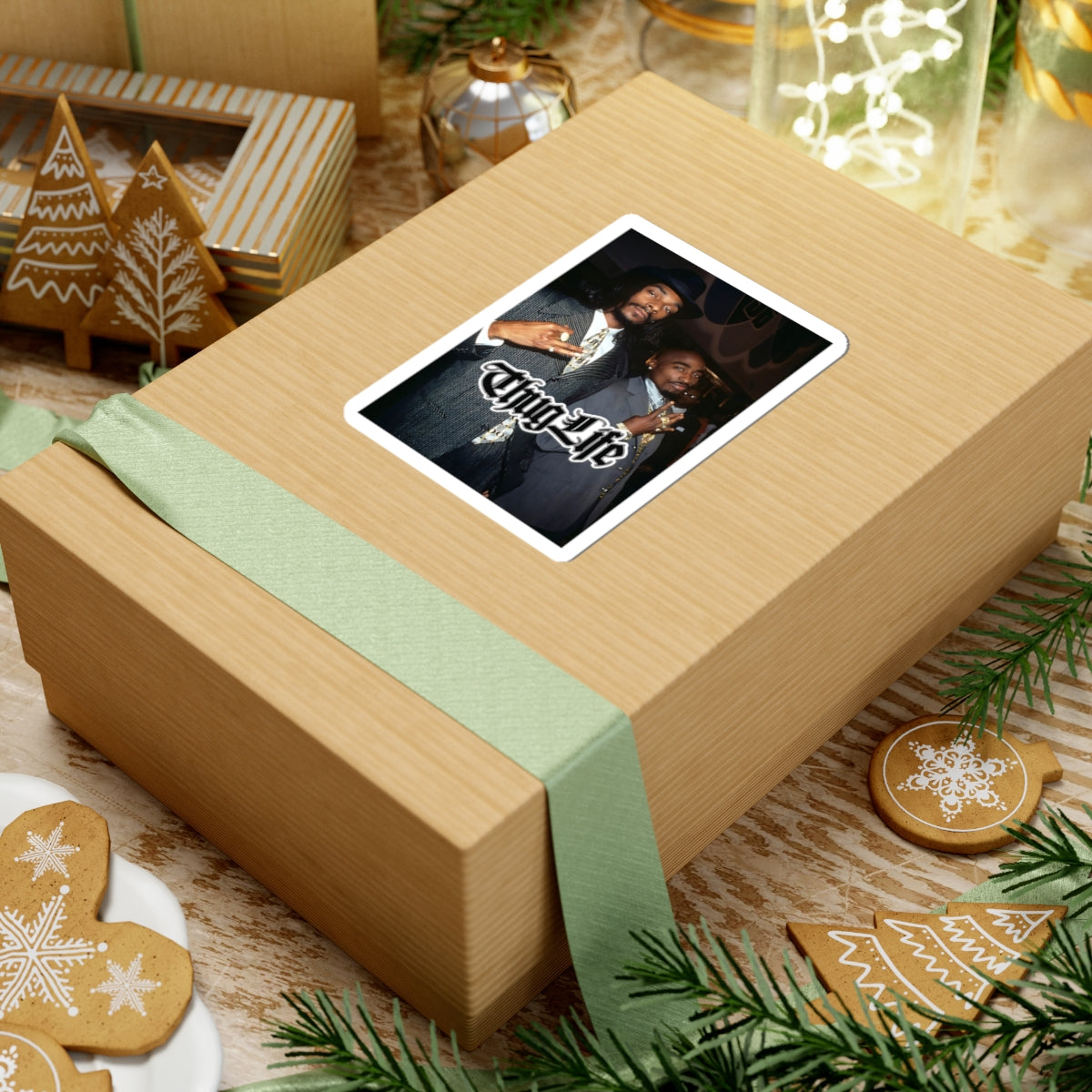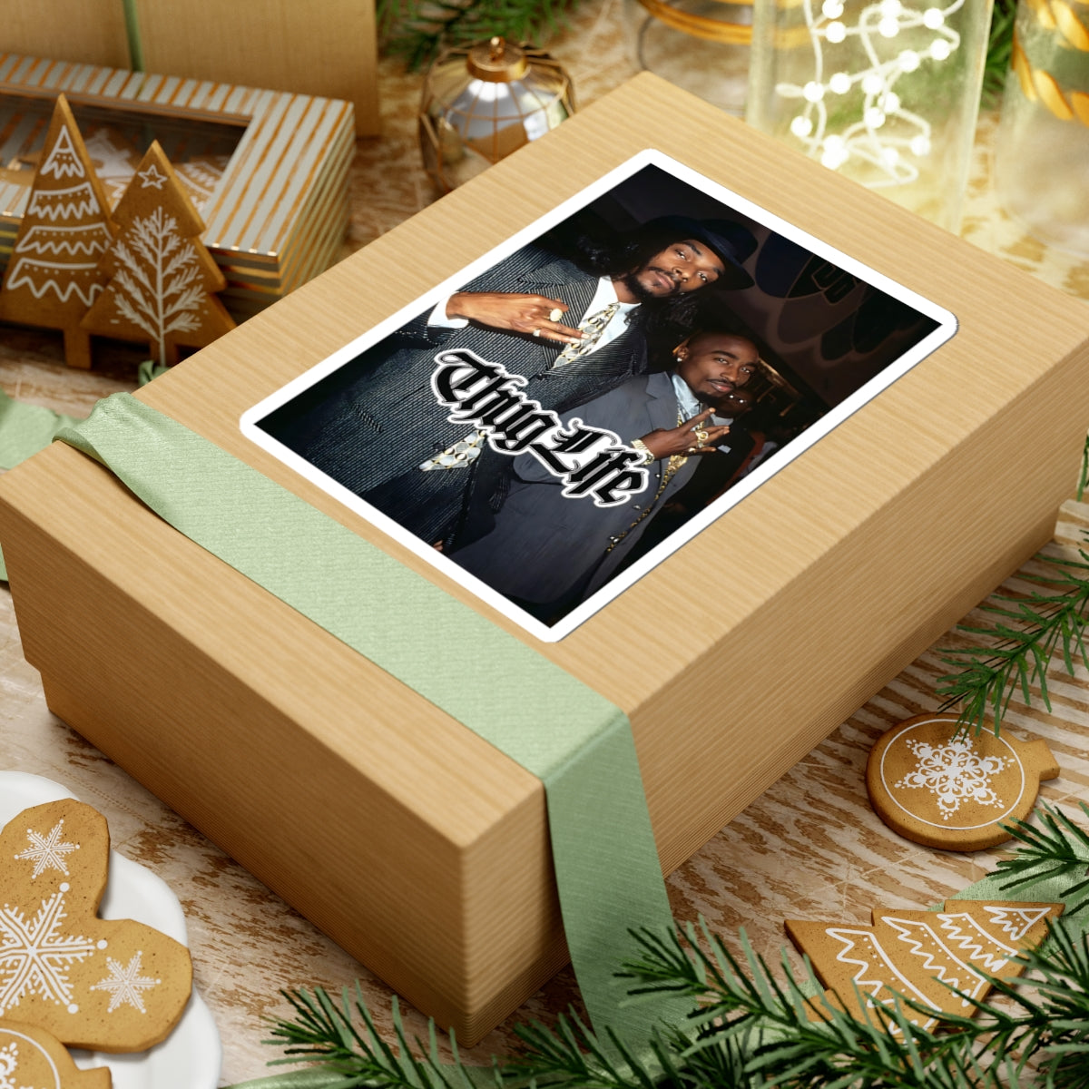 A cartoon-style sticker featuring Snoop Dogg with a relaxed and confident pose, wearing sunglasses and a bandana, with a gold chain around his neck. The background includes graffiti elements and bold, vibrant colors. Incorporate the iconic 'Thug Life' text in graffiti font, with a cool and edgy rap vibe. The overall style is playful yet street-wise, perfect for a rap-themed sticker