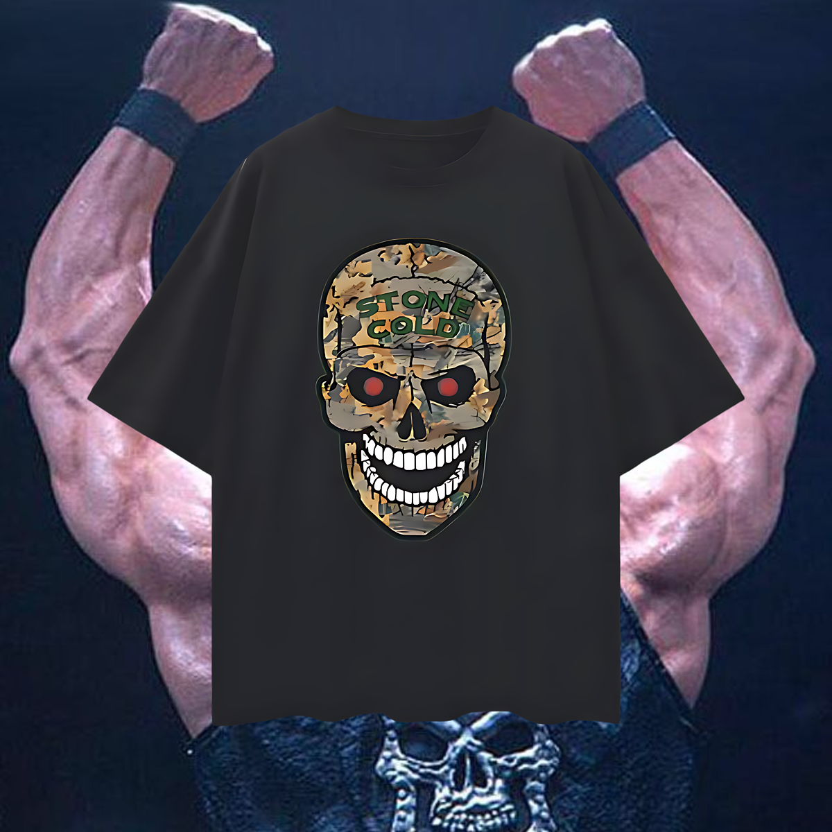 The Vintage Like Camo Skull Cold Stone Steve Austin Oversized T-Shirt features a unique design that combines classic camo patterns with a bold skull illustration, making it a stylish choice for fans of wrestling and vintage apparel. This oversized fit ensures comfort while paying homage to the legendary wrestler known for his tough persona and iconic catchphrases. Ideal for casual outings or lounging, it captures a nostalgic feel that appeals to both collectors and new fans alike.