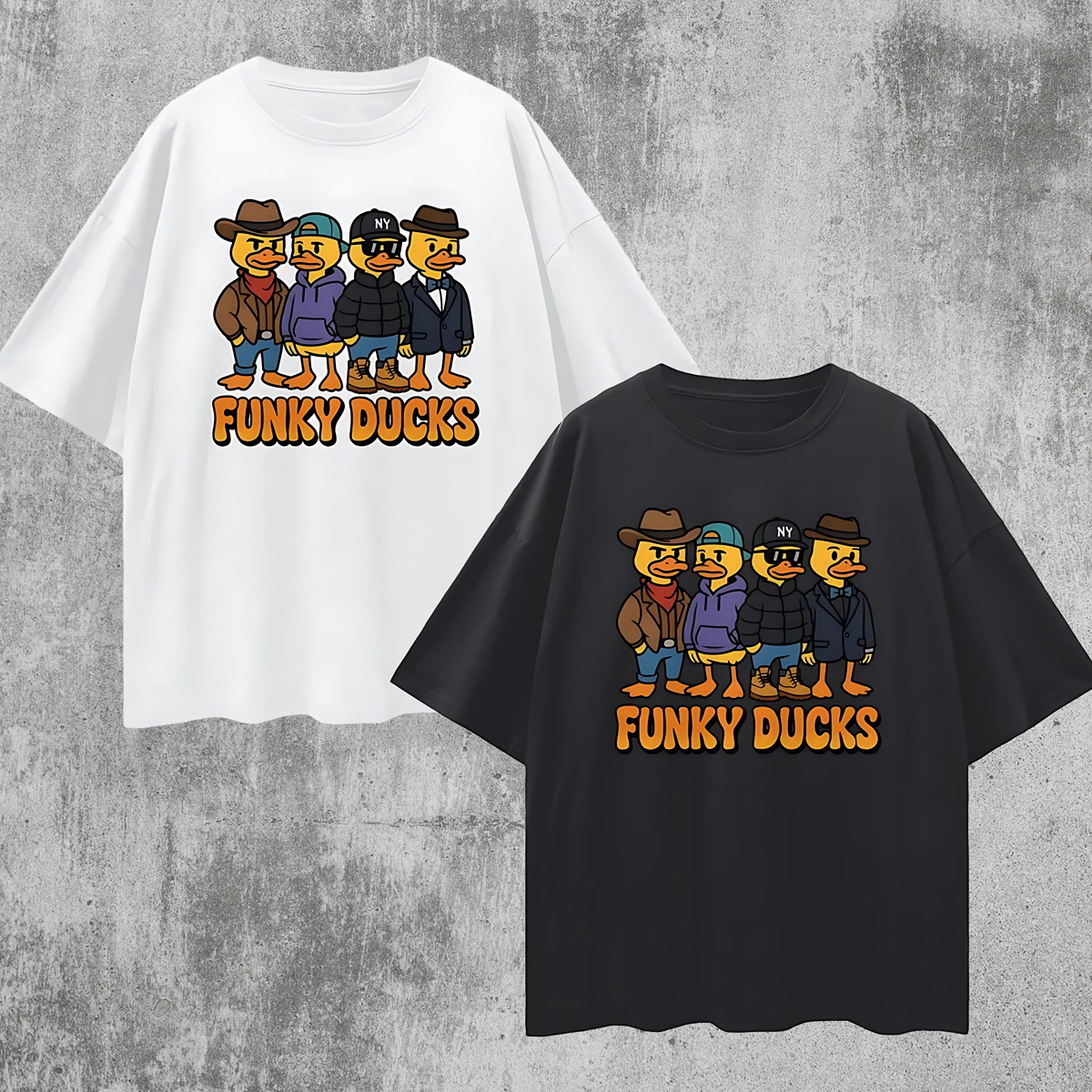 This Vintage/Y2K Funny Funky Ducks Graphic Oversized T-Shirt delivers a playful and stylish vibe with a lineup of quirky, personality-packed ducks, each rocking a unique outfit—from bold cowboy fashion and laid-back streetwear to classic Timbs with a New York cap, and an elegant, classy look. Below the crew, the words “Funky Ducks” pop in cool, bubbly letters, adding a retro charm. Perfect for those who love humor, street style, and standout vintage-inspired graphics.