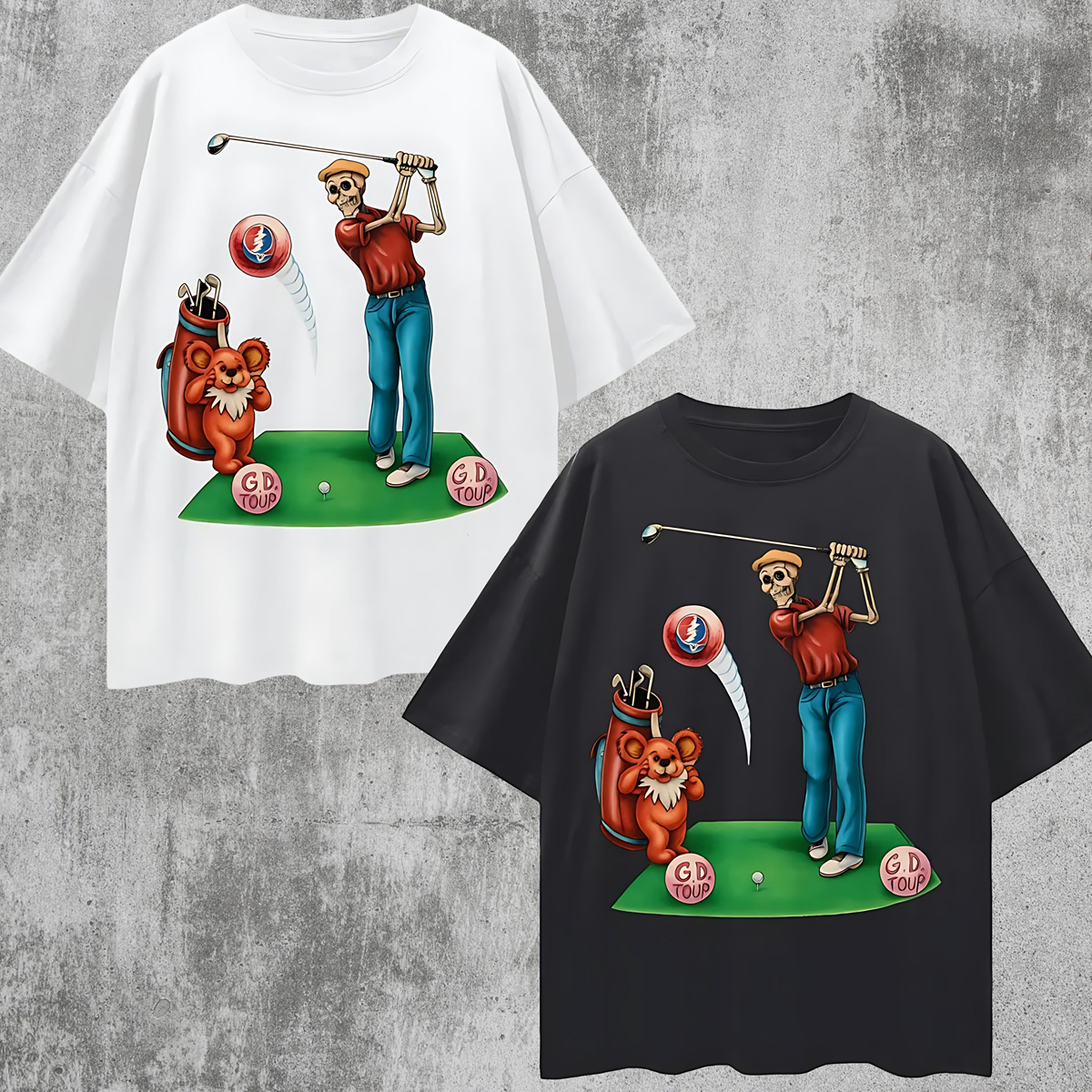 Vintage/Y2K Grateful Dead Golfing Oversized T-Shirt – A rare and vibrant tribute merging the legendary Grateful Dead aesthetic with playful golfing artwork. Featuring colorful skeleton and bear characters teeing off against psychedelic-inspired backdrops, this oversized tee blends music culture, retro streetwear, and whimsical sports vibes for a truly unique statement piece.