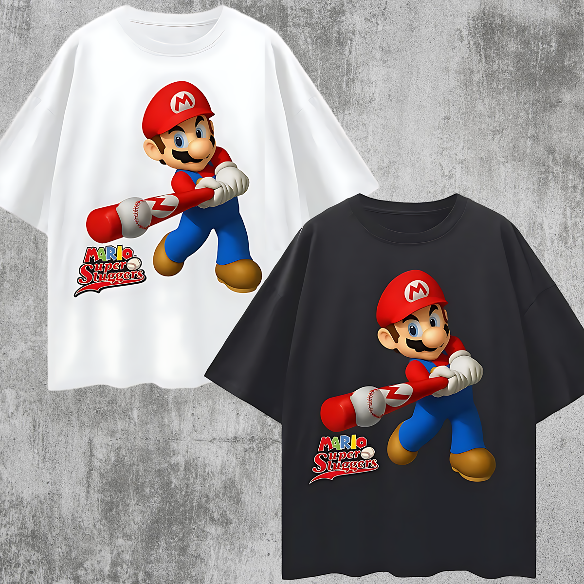 Step up to the plate in classic gamer style with this retro-inspired tee. Featuring a bold, colorful graphic of Mario in full swing from the Super Sluggers baseball series, this shirt captures the fun energy of vintage Y2K gaming culture. Printed on a soft, worn-in style fabric, it’s perfect for fans of Nintendo nostalgia, streetwear lovers, and collectors of iconic video game apparel. A true statement piece that blends playful design with throwback vibes.