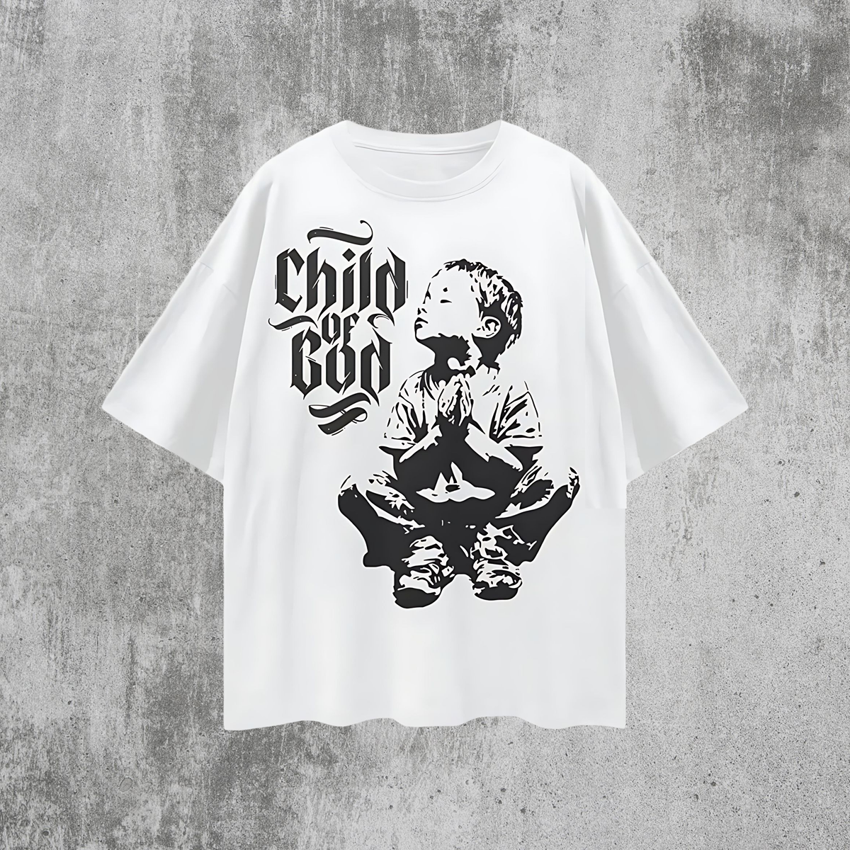 Vintage Streetwear "Dear Heavenly Father" Praying Boy Graphic Oversized T-Shirt – Featuring a bold stencil-style illustration of a young boy sitting cross-legged in prayer, gazing upward with hands clasped. Above him, the phrase Dear Heavenly Father is printed in a striking streetwear-inspired font, giving the design a modern urban edge. Perfect for faith-driven streetwear lovers, this oversized tee blends spiritual meaning with minimalist black-and-white graphic style for a powerful, wearable statement.